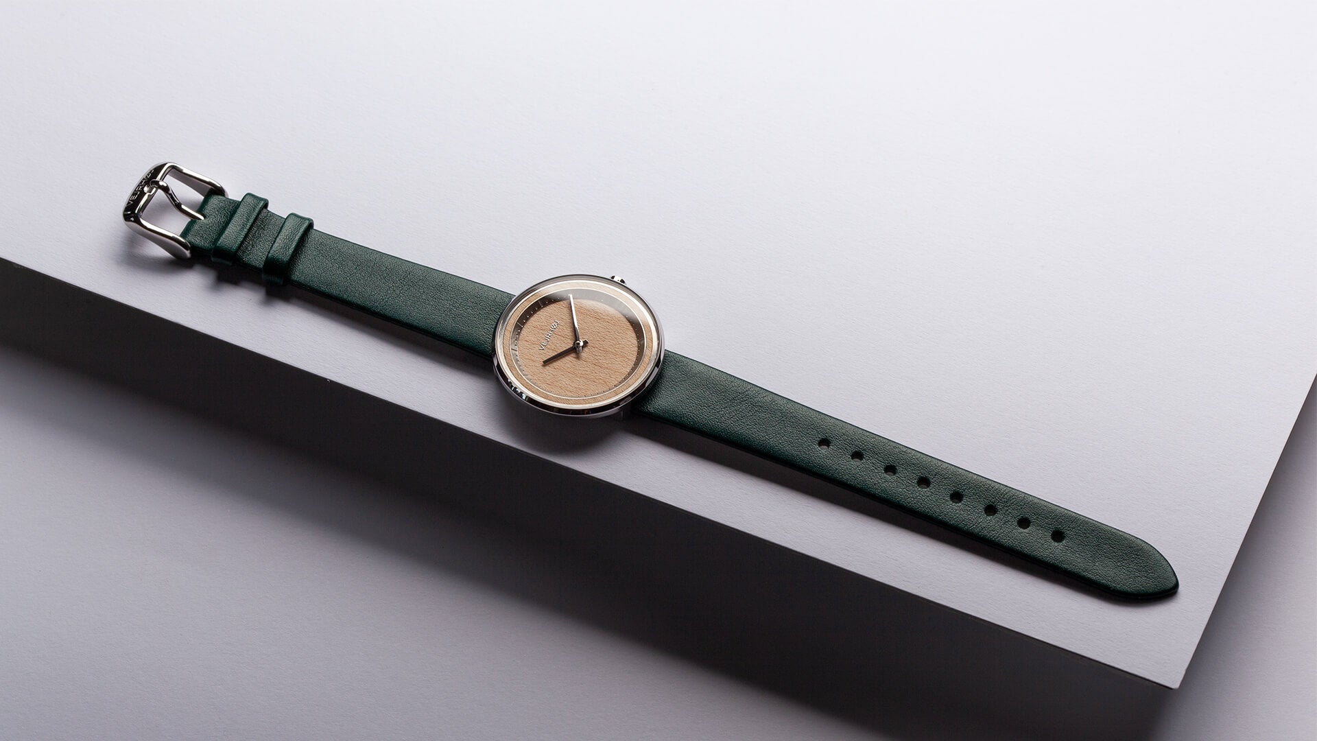 The thin casing and 34mm diameter make this model the ideal choice for women who are looking for a small & elegant wooden watch. The design merges natural maple wood and stainless steel. All wooden elements of the watch are placed underneath strong mineral crystal glass with a sapphire coating, which gives this slim timepiece the same durability as a solid steel watch. Finally, the deep green leather strap comes with a quick release function, which makes it easy to change without the use of any tools.